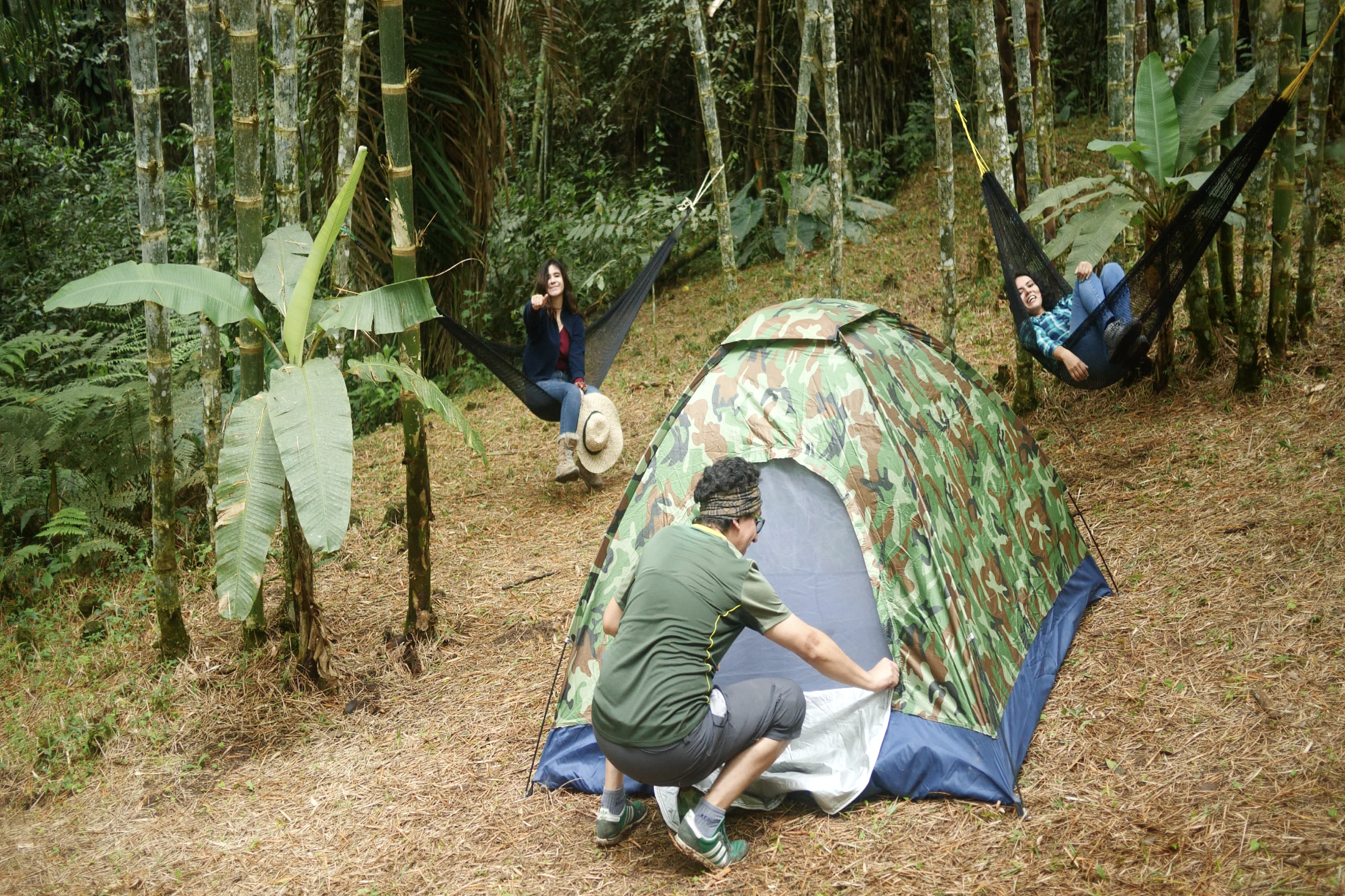 Lugar para acampar al aire libre en medio de un bosque de bambú equipado con baño y ducha, asadero y chozón para descanso.